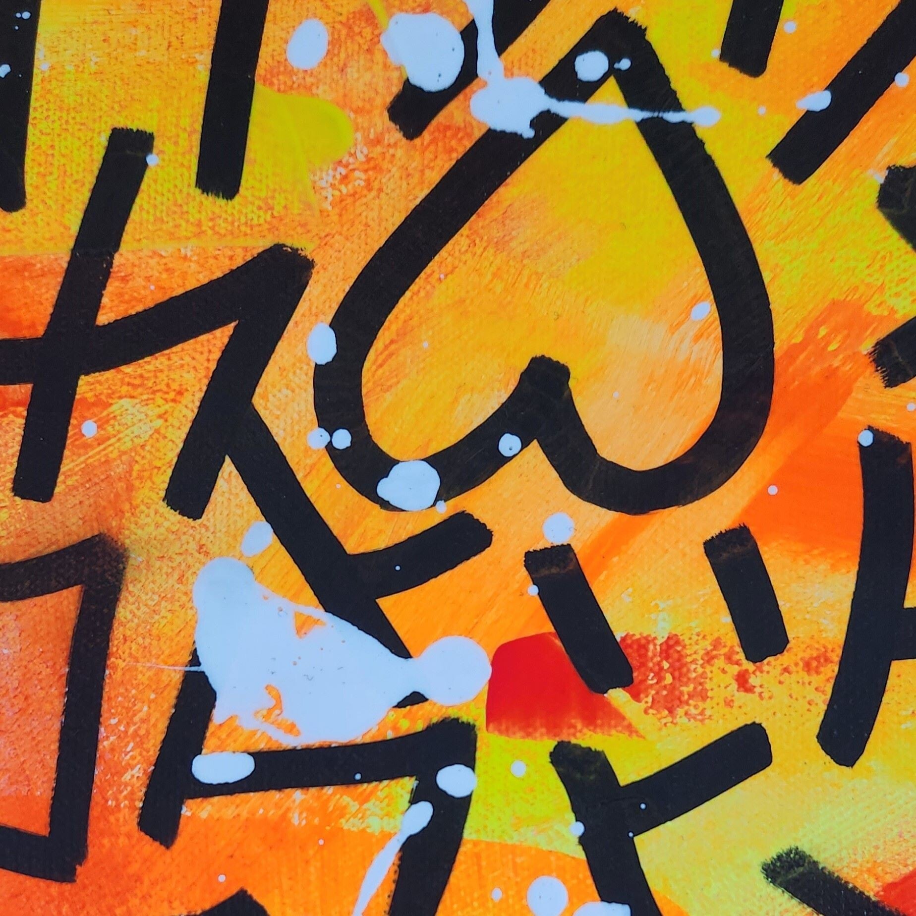 La surface est saturée de signes, de gestes rapides et incisifs. Les tracés noirs s'entrechoquent sur un fond incandescent, comme une écriture sous pression.